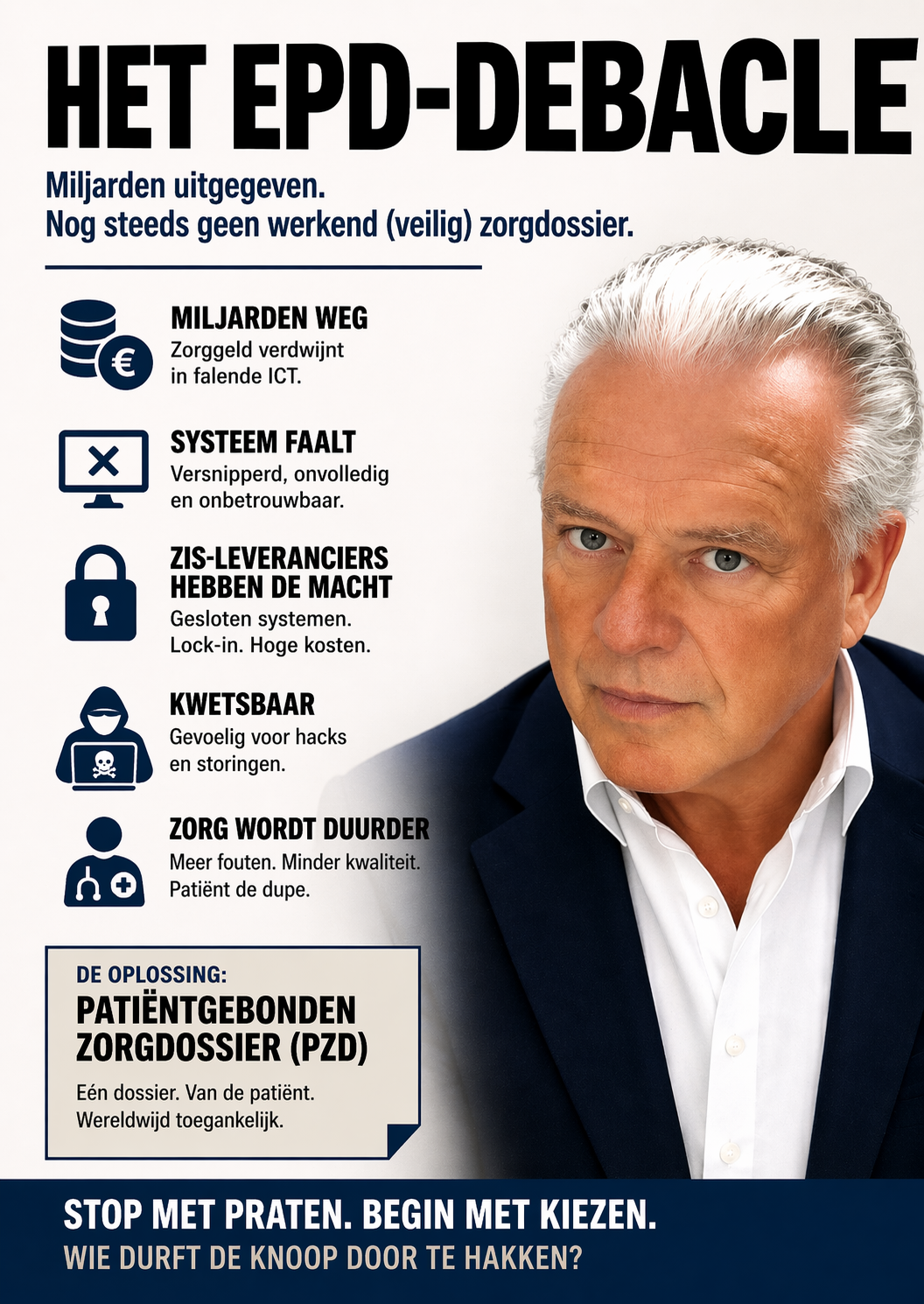 Het had de zorg beter moeten maken. Veiliger, efficiënter, overzichtelijker. Het Elektronisch Patiëntendossier werd gepresenteerd als dé oplossing voor een modern zorgsysteem. De werkelijkheid is hard: Nederland heeft miljarden aan zorggeld uitgegeven aan een systeem dat in de kern niet werkt. Zorgverleners worstelen dagelijks met versnipperde informatie, omslachtige systemen en gebrekkige communicatie. Patiënten moeten hun medische geschiedenis telkens opnieuw vertellen, omdat gegevens niet compleet of niet toegankelijk zijn. Wat bedoeld was als vooruitgang, heeft geleid tot frustratie, fouten en risico’s . Dit is geen incident. Dit is structureel falen.